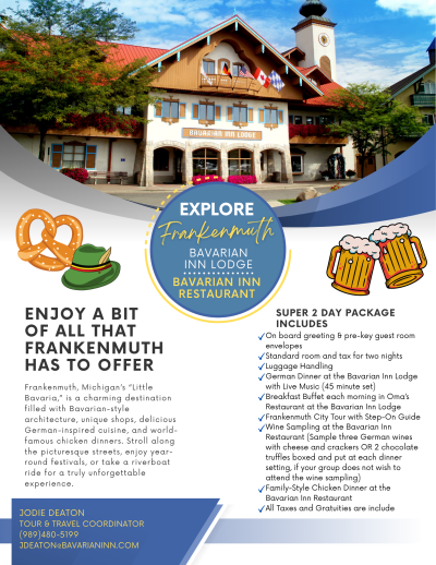 Enjoy the ultimate Frankenmuth getaway with our Super 2-Day Package, designed for comfort, entertainment, and true Bavarian hospitality. Your stay includes two nights’ accommodations with luggage handling and a warm on-board greeting with pre-keyed room envelopes for easy check-in. Savor a German Dinner at the Bavarian Inn Lodge complete with live music, a Family-Style Chicken Dinner at the world-famous Bavarian Inn Restaurant, and hearty breakfast buffets each morning. Your group will also enjoy a guided city tour, wine sampling (or truffle option), and time to explore Michigan’s Little Bavaria. All taxes and gratuities are included—just relax and enjoy a perfectly planned two-day Frankenmuth experience!